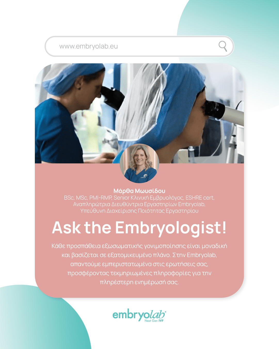 Μάρθα Μωυσίδου, BSc, MSc, PMI-RMP, Senior Kλινική Εμβρυολόγος, ESHRE Cert., Aναπληρώτρια Διευθύντρια Εργαστηρίων Embryolab, Υπεύθυνη Διαχείρισης Ποιότητας Εργαστηρίου